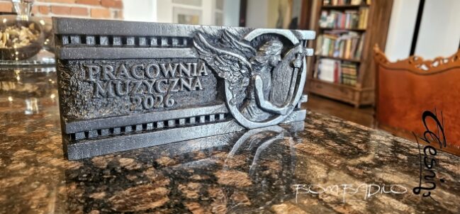 To, co wyróżnia prace Pracowni Artystycznej BOMBADILO, to przede wszystkim bezkompromisowe podejście do materiału i formy. Prezentowana tablica pamiątkowa „Pracownia Muzyczna 2026” nie jest produktem masowym – to polskie rękodzieło. Całość została ręcznie wyrzeźbiona przez lokalnego artystę Łukasza Cześniaka, co nadaje jej niepowtarzalną fakturę i duszę, której próżno szukać w odlewach maszynowych.
