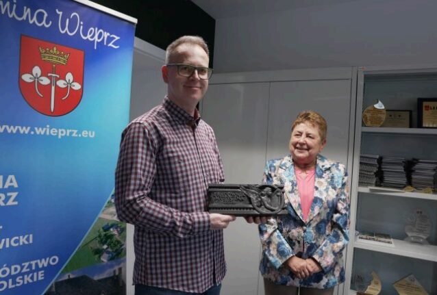 Przekazanie pamiątkowej, ręcznie rzeźbionej tablicy, autorstwa Łukasza Cześniaka, z Pracowni Artystycznej Bombadilo. Źródło: facebook.com